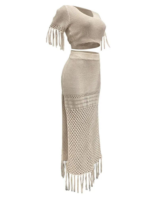 Deep V Neck Ruffled Knit 2-Piece Skirt Set