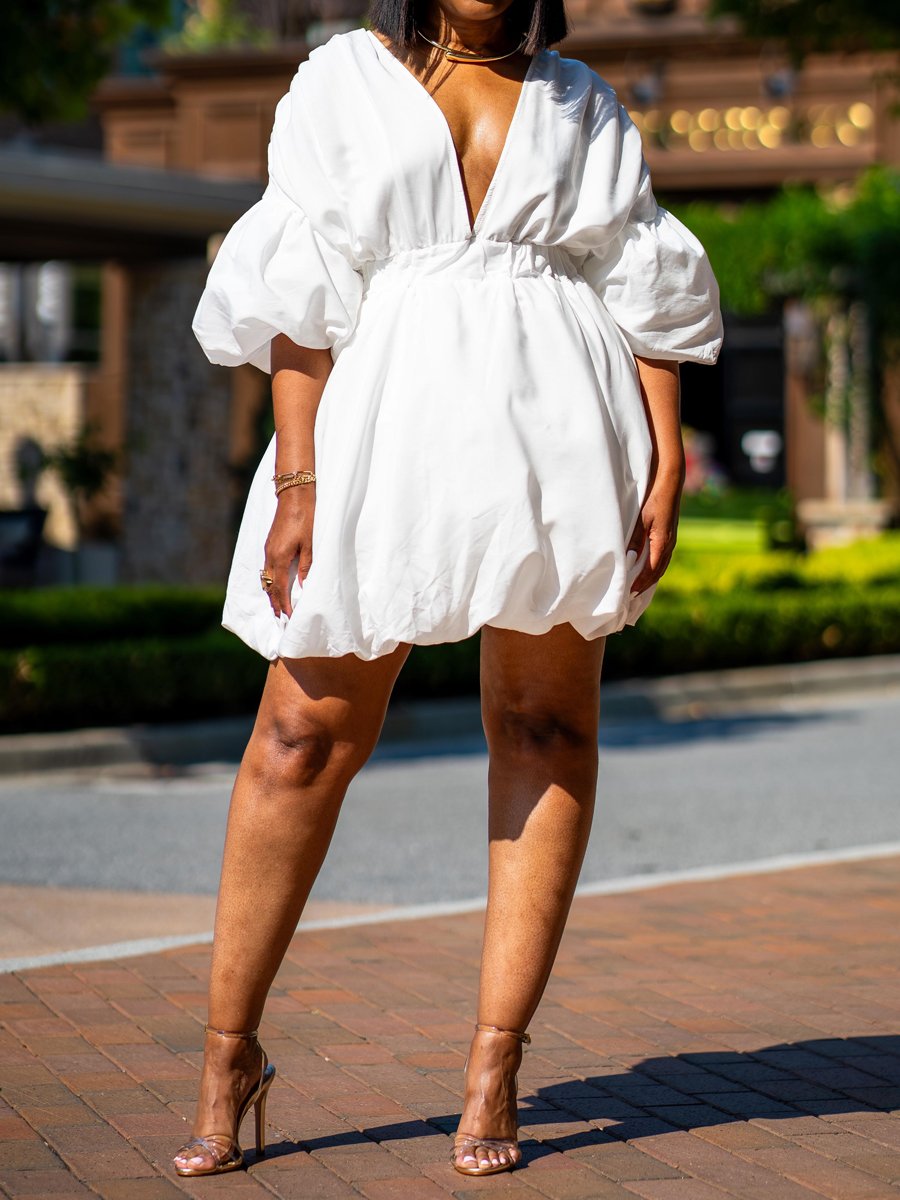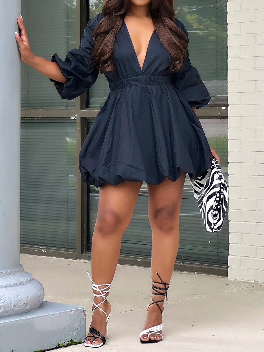 Deep V Neck Fashion Lantern Sleeve Mini Dress
