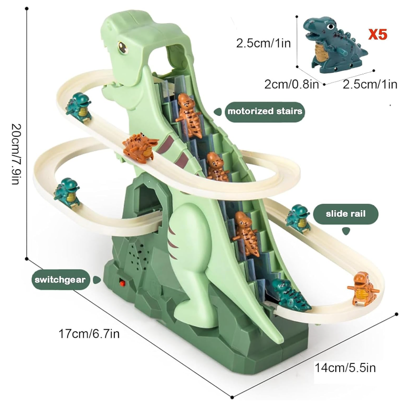 - 【Interactive Dinosaur Climbing Adventure】Watch 5 colorful dinosaurs climb stairs autonomously with flashing lights and upbeat music! This electric racing track toy sparks imaginative play, encouraging kids to cheer on their dinos while fostering curiosity about movement and cause-effect relationships.