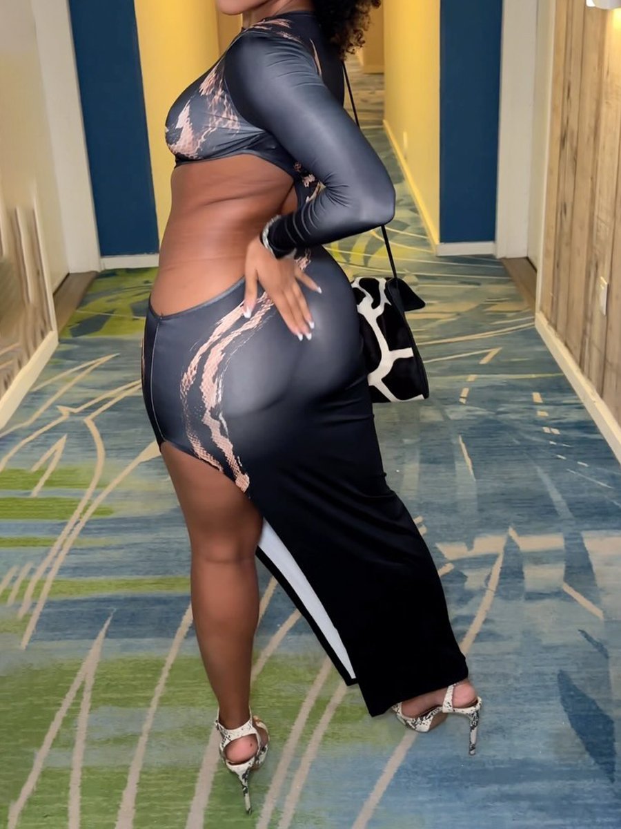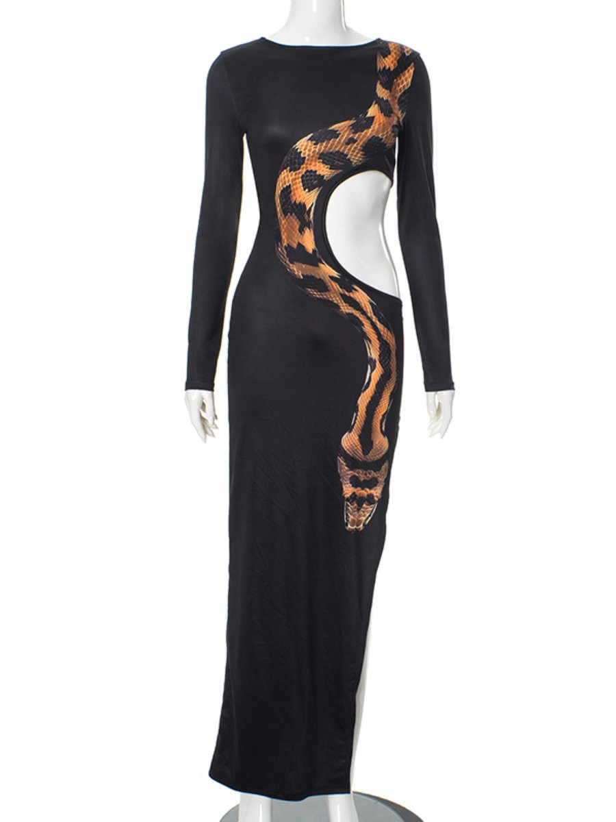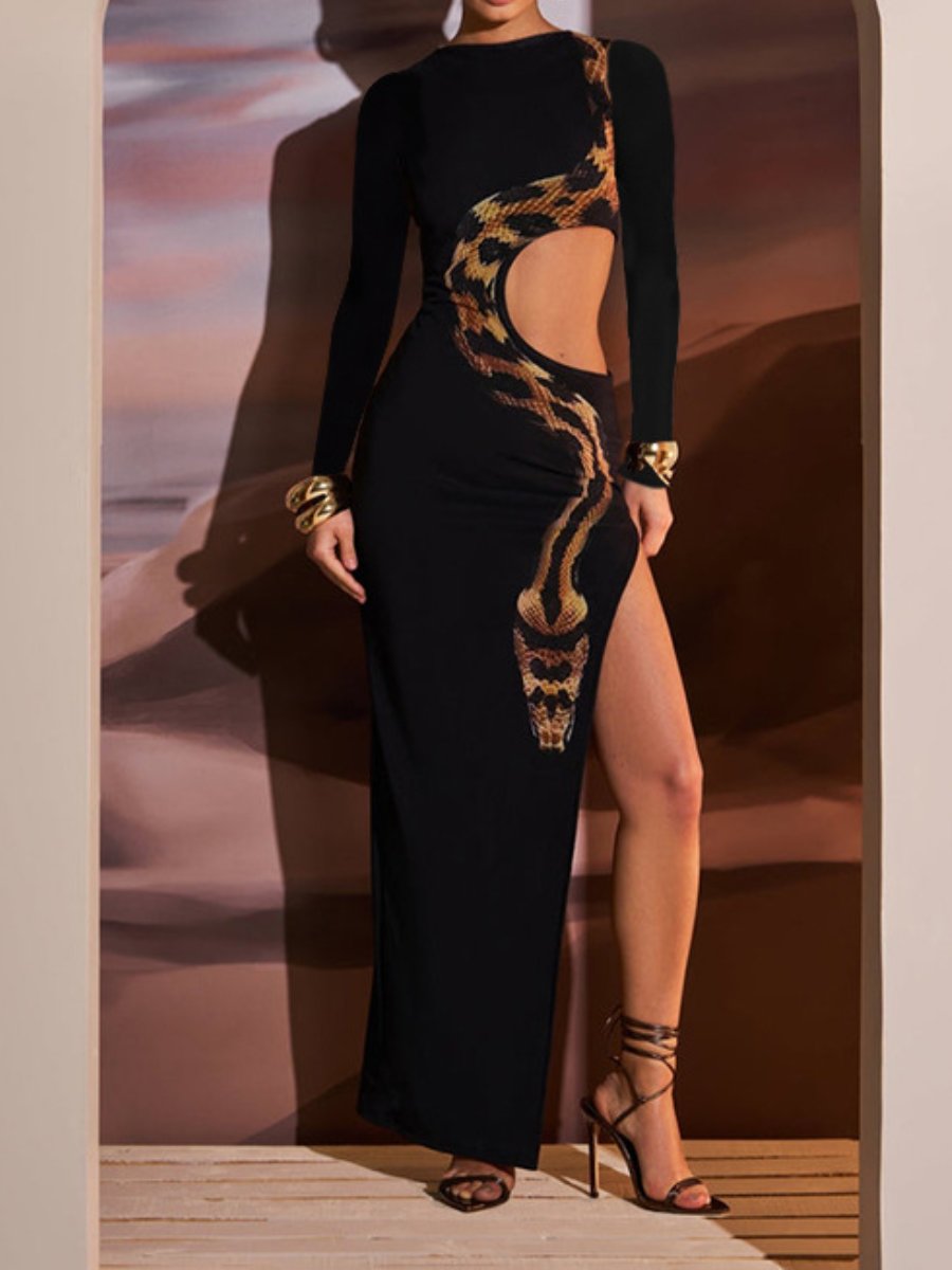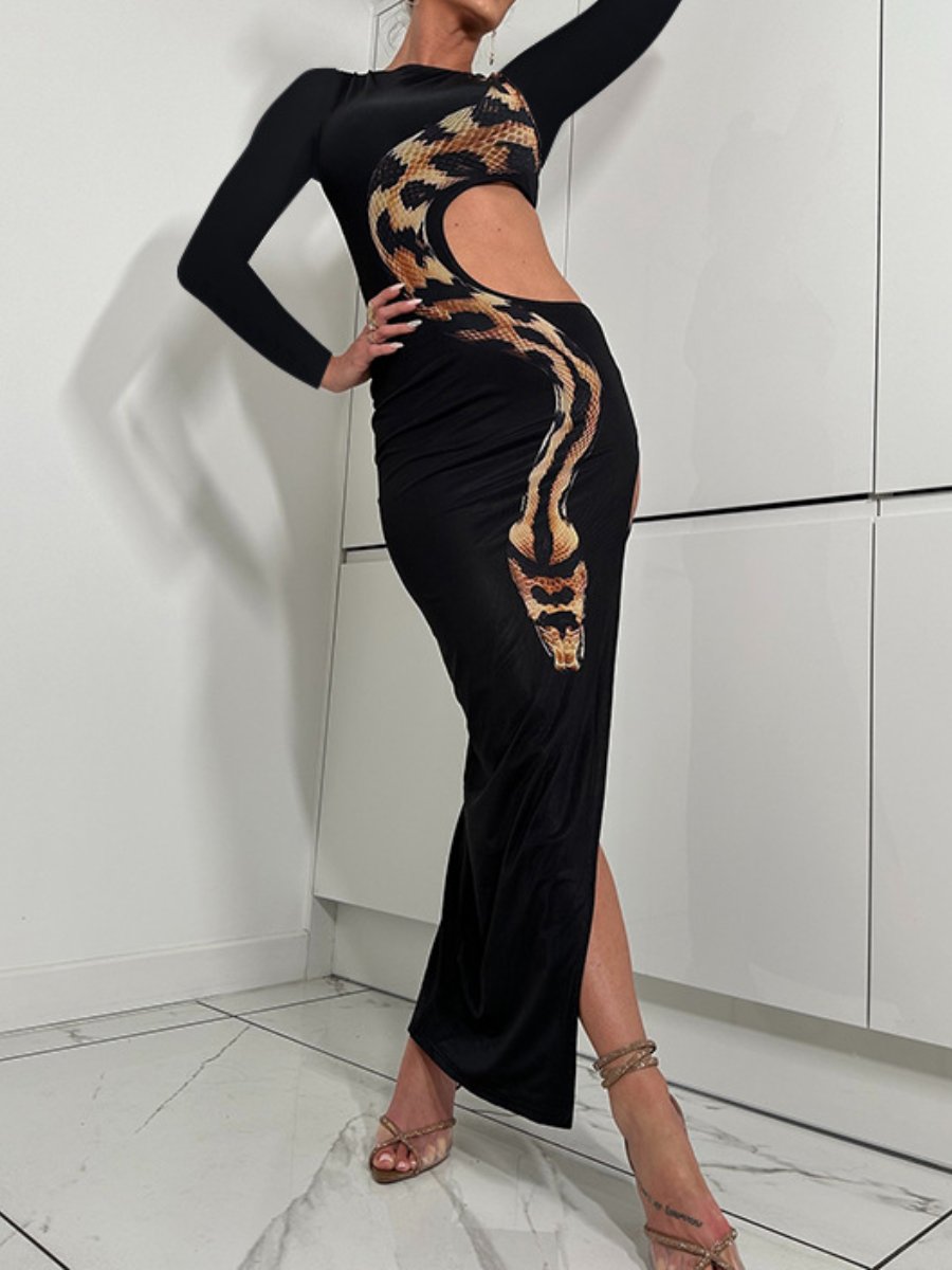 High Split Long Sleeve Sexy Cutout Snake Print Dress