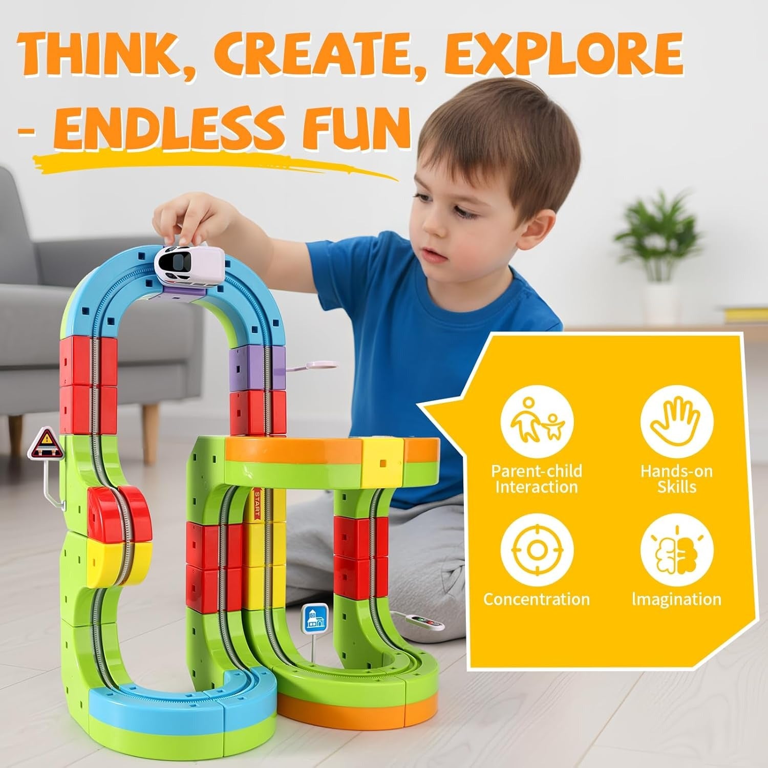 Modular 3D Track Design– Colorful cubes easily snap together, allowing kids to build flexible race and train tracks with bridges, climbs, curves, and twisty layouts