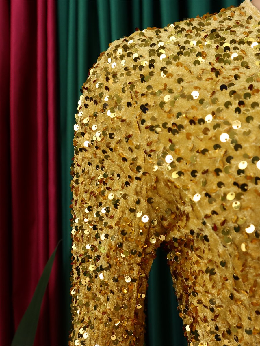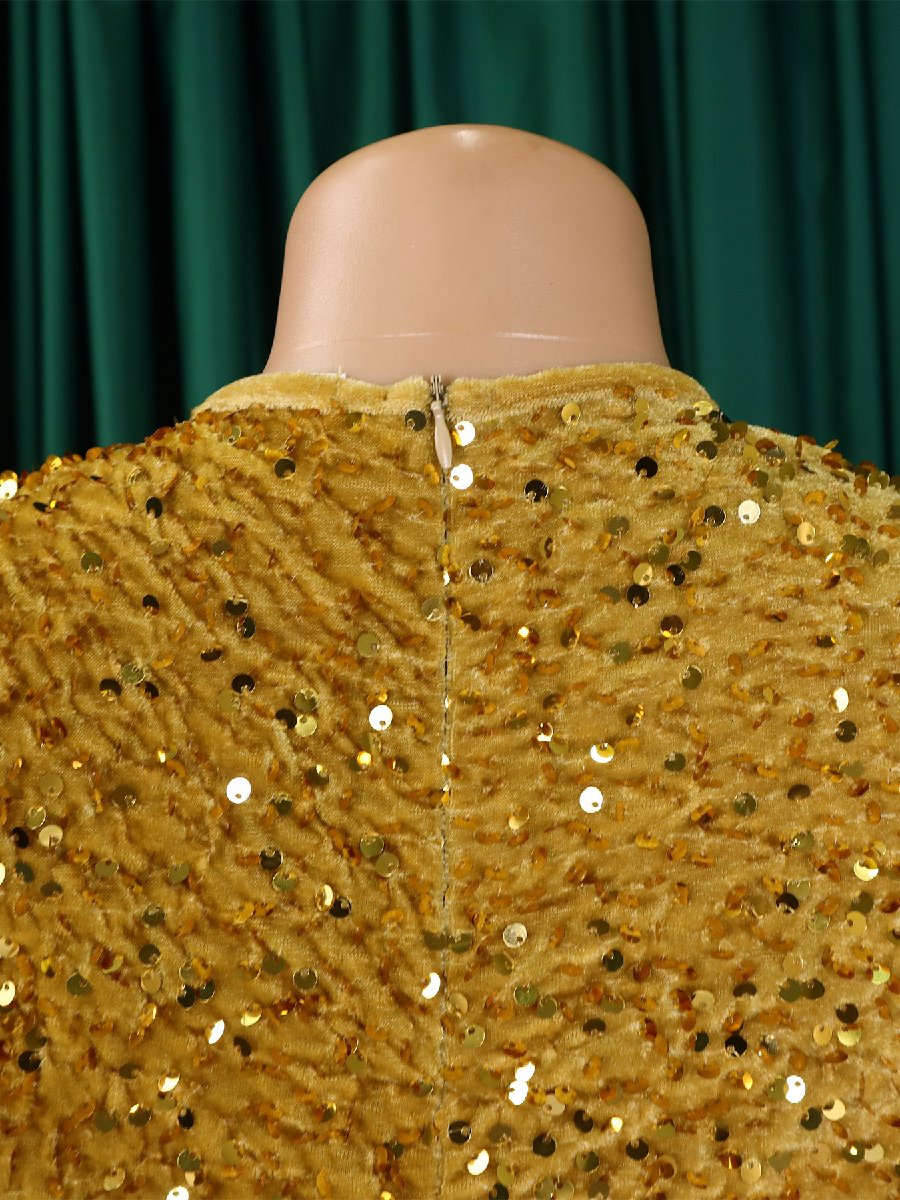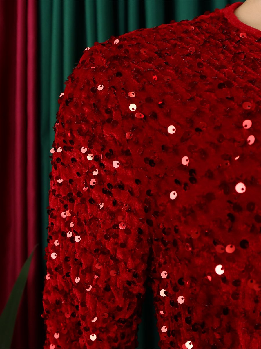 Round Neck Long Sleeve Solid Color Sequined Dress