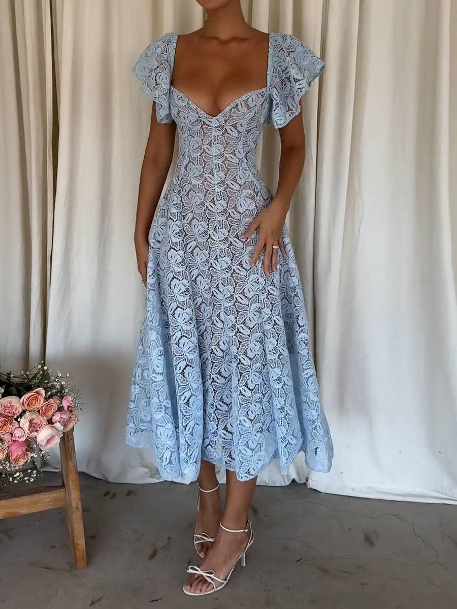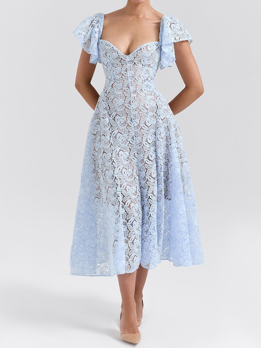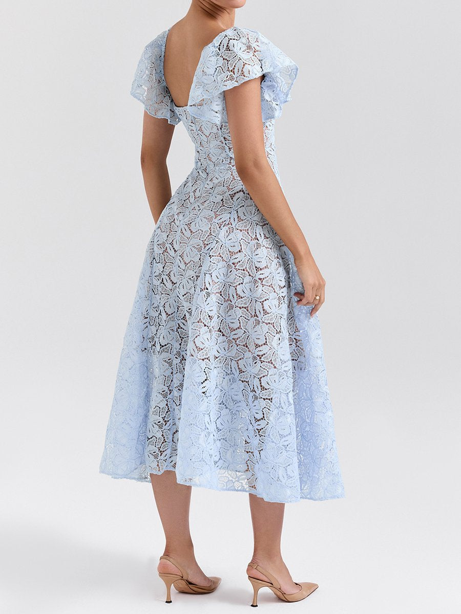 Square Collar Floral Lace Midi Dress