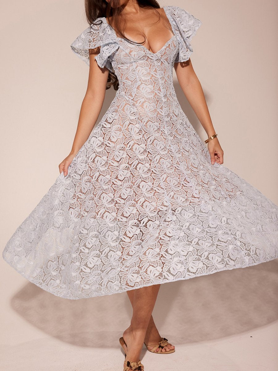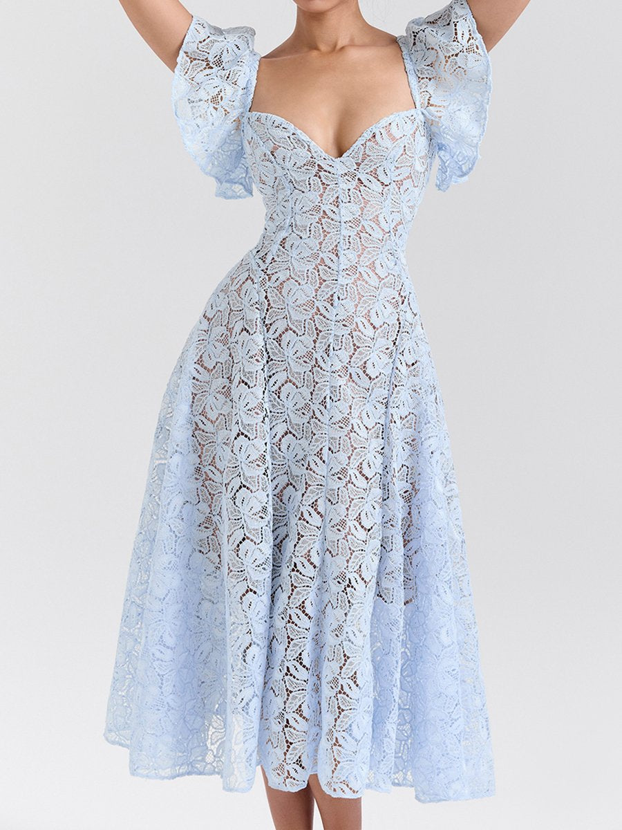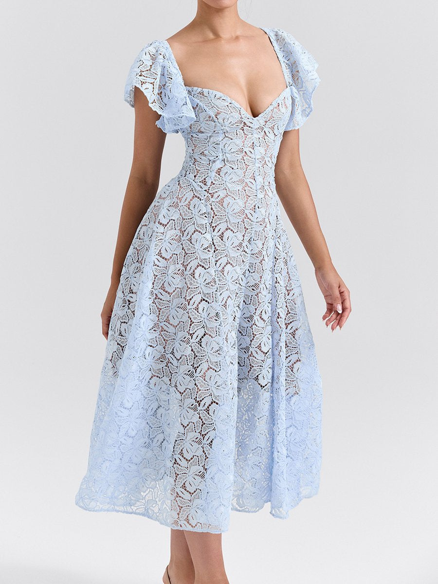 Square Collar Floral Lace Midi Dress