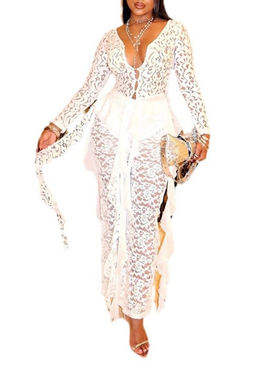 Sweet And Fresh V-neck Long Sleeve Lace Two-piece Set